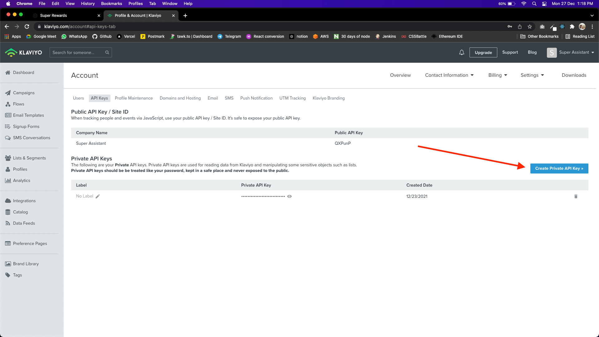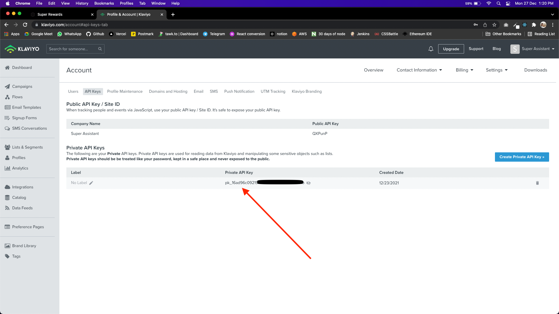 Click on Take me to API Key, this will take you to your klaviyo dashboard.